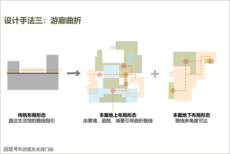 在确保主入口仪式感的同时,重新解构生活馆功能;围绕地上与地下空间流线,分别植入8个主次庭院,以提高景观的可视性;并利用曲折的游廊系统串联分散的空间,形成可望亦可游的庭院空间。通过多点体验的流动奢境,既避免空间压迫感,又实现私密性与开放性的动态平衡。