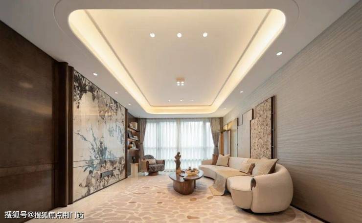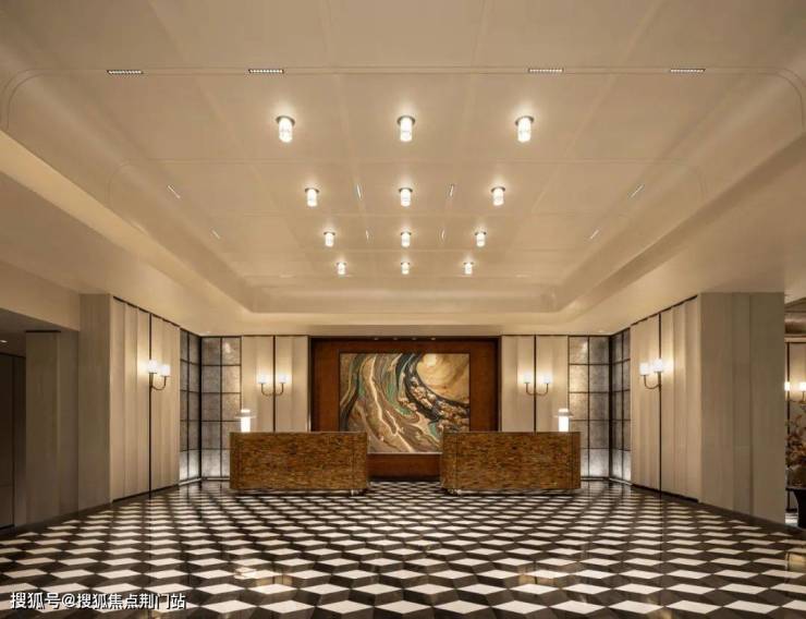 主入口吊顶借鉴古代建筑中的”藻井“元素,在形式上加以简化,运用皇家白玉石材等现代材质,方正通透,符合现代审美。