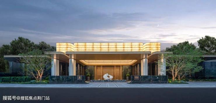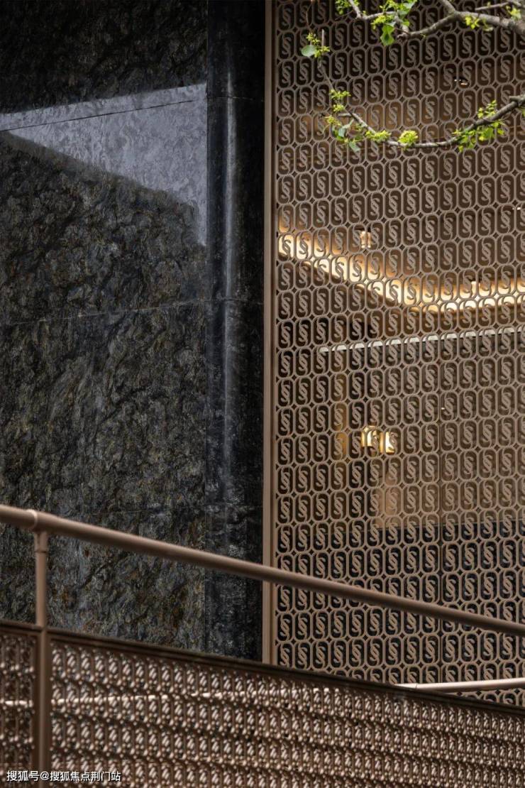 在材质的运用上,主张自然高奢主义,注重自然元素的运用与材质的混搭。将奢石、不锈钢、仿古铜等现代材质进行简化与组合,以模仿”金镶玉“的传统装饰效果,应用于整体立面设计之中,突显东方瑰丽气质。在色彩上相应的提取朱砂、琥珀、翡翠等极具东方韵味的瑰宝色系,应用于主体建筑与景观空间,呈现奢华馥郁质感。