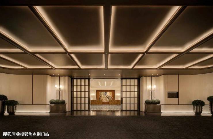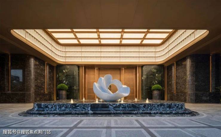 步入门庭,云石吊顶之下,借鉴中国古代建筑中的“藻井”做法,由522片皇家白玉石材拼接而成,凝聚光华,辉映时空。华光之下,中心水池承托起艺术雕塑,莹润皎洁,宛若珍宝。立面则采用铂金钻奢石,搭配墨绿荷塘月色奢石、安哥拉黑奢石花钵、以及手工锻造的巨幅铜门,流淌出一抹温润质感。