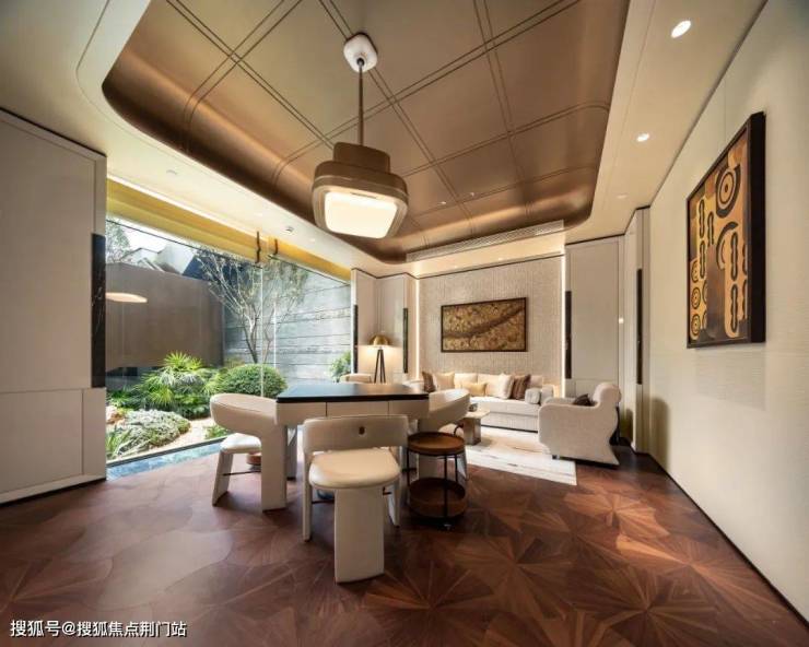 洽谈区位于地上一层。黑白棕三色几何拼花地砖、米白色皮革沙发界定空间界限;暖调灯光烘托之下,艺术装饰画与落地窗外的自然画卷相映成趣,颇具东方韵味。