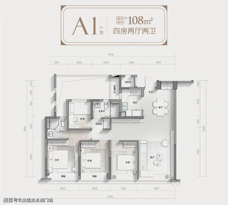 108平方米的中间套做成了四房两卫,四开间朝南。四个卧室有三个南卧,过道还预留了一个空间,后期打柜子或是做一个休闲区都很合适。