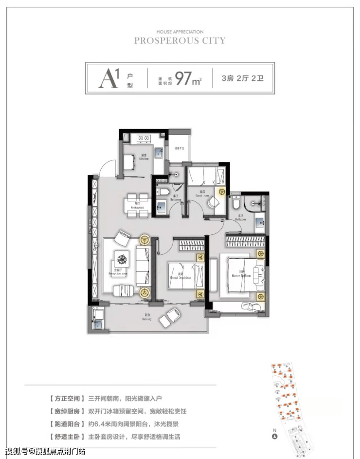 三开间朝南、动静分区,客厅和南次卧带连通阳台,较为舒适。