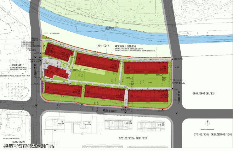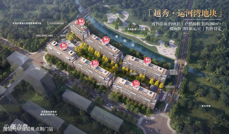 项目北面河景,再往远处是上塘高架,直线约150米左右;东面商地,小区主要出入口就在这个方向;西、南两面有次要出入口;