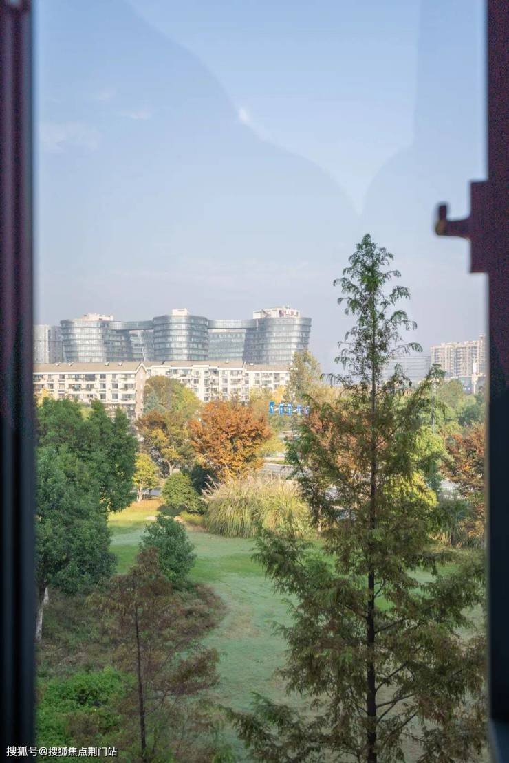 北房间的落地玻璃,窗外秋黄的风景更加壮观,像是一幅巨画,甚至不远处还能看到西湖群山山脉(高楼层会更明显)。