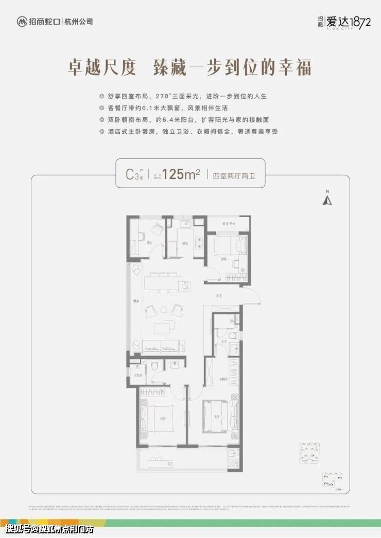在户型上,共推出建面约106㎡/125㎡两大户型,其中建面约106㎡户型完美契合年轻人的置业需求,无论是LDKB一体化设计、正三房+双卫的格局,还是约3.5南向大开间、“1+X”创变空间的尺度,都做到了改善级空间感;而建面约125㎡大四房户型则以270°三面采光、奢阔客餐厅、双卧朝南等创新布局,为置业者实现一步到位的生活。