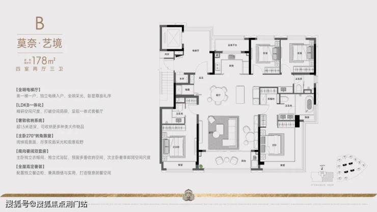 四开间约14.4米面宽全朝南,还带独立电梯厅,尺度非凡;主卧的270°转角飘窗,叠加超大面玻璃,尽享无边界的视野采光;超1米进深储藏空间,随心收纳;LDKB无界相连,恣意展开舒适的生活……