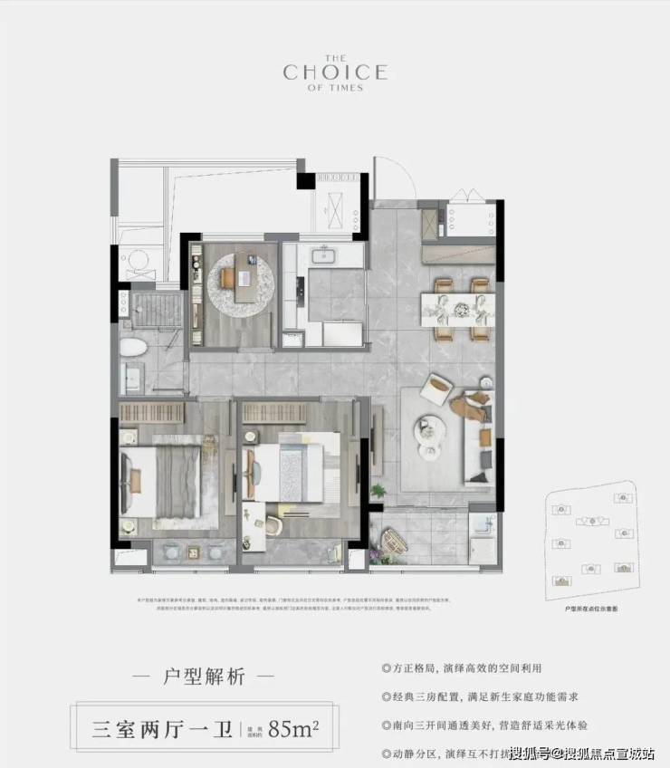 建面约85方:在当今的杭州楼市,不要说85方,就是89方,都已经消失的差不多了。85方做到了三房一卫,三开间朝南设计,餐客厅一体带南向阳台,且做到了封闭式阳台,还只算一半面积。