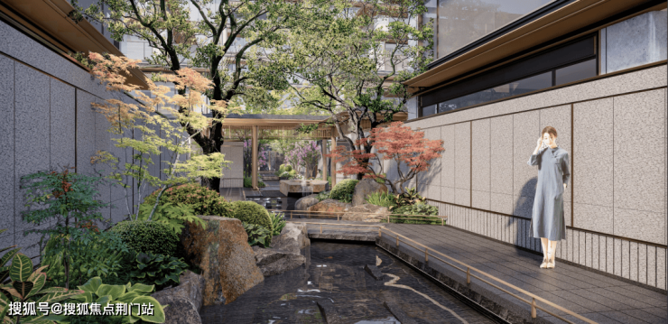 雲润宸庐从这幅古画中汲取灵感,打造了近 9米高差的下沉庭院。瀑布从石壁倾泻而下,雾气氤氲、树影摇曳……仿佛不是走在下沉式会所庭院,而是步入了一幅立体山水画。