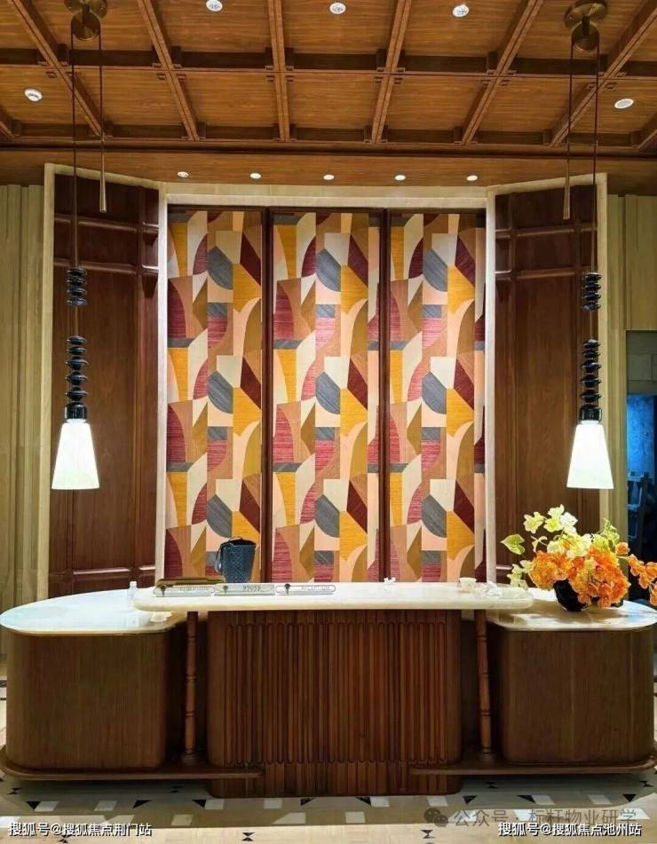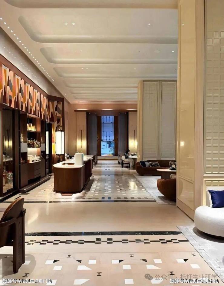 玉树门庭,传承芝澜月华的优雅入口,墙面采用贝金米黄石材,高达7米的玉树构架以UHPC材质精心打造,柱身巧妙嵌入蓝翡翠玉石与亚马逊绿奢石,尽显奢华与精致。