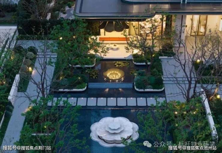 下沉式庭院巧妙借鉴自然山谷的形态,以叠水、绿阶、浮岛等元素精心构筑,呈现“飞瀑挂崖”的生动景致。庭院中央的女王画舫若隐若现于林水之间,业主可在此品茗赏景,尽享“都市女王”般的优雅与从容。