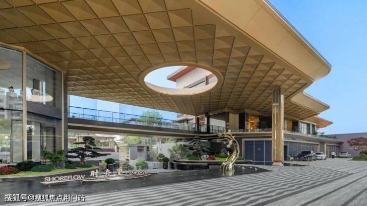 整体的抬高,让约70米宽的鎏金天幕大门头高度达到了约9米,显得格外气势非凡。天桥连接了会客厅、架空层和内部园林。