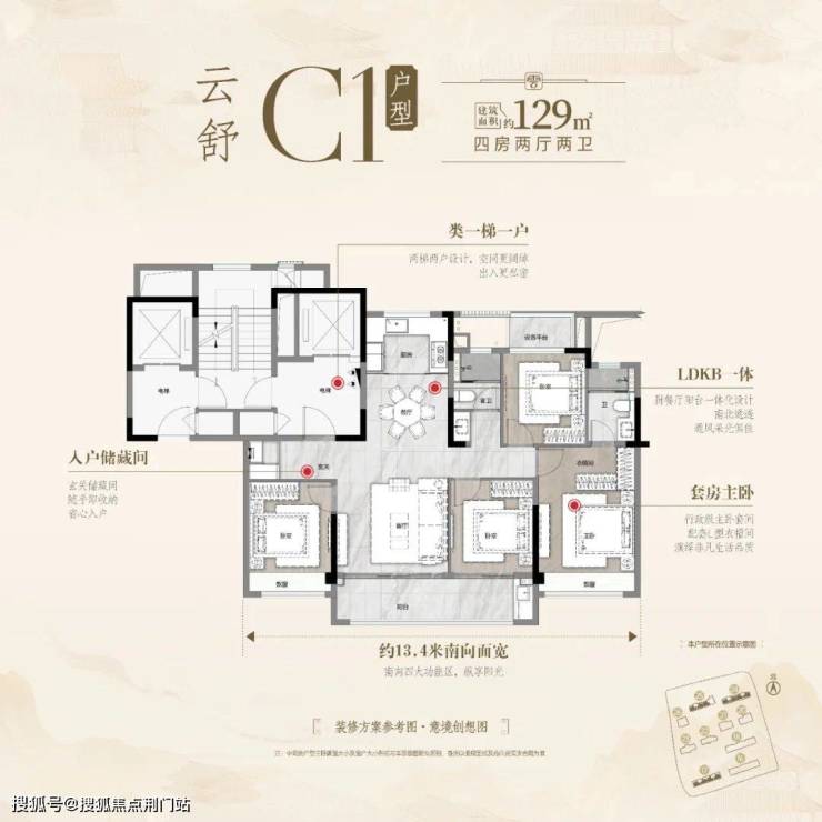 客厅+3卧一字排开,南向总面宽达约13.4米,收获满室阳光。门口带独立电梯前厅,相当于多一处“外挂玄关”,入户同样设储藏间;主卧套房带L型衣帽间,在收纳和舒适度上几乎做到极致。