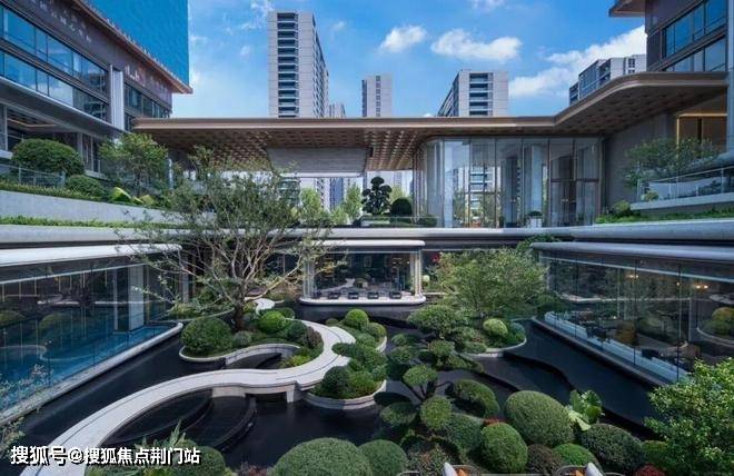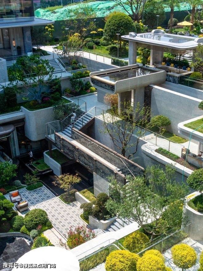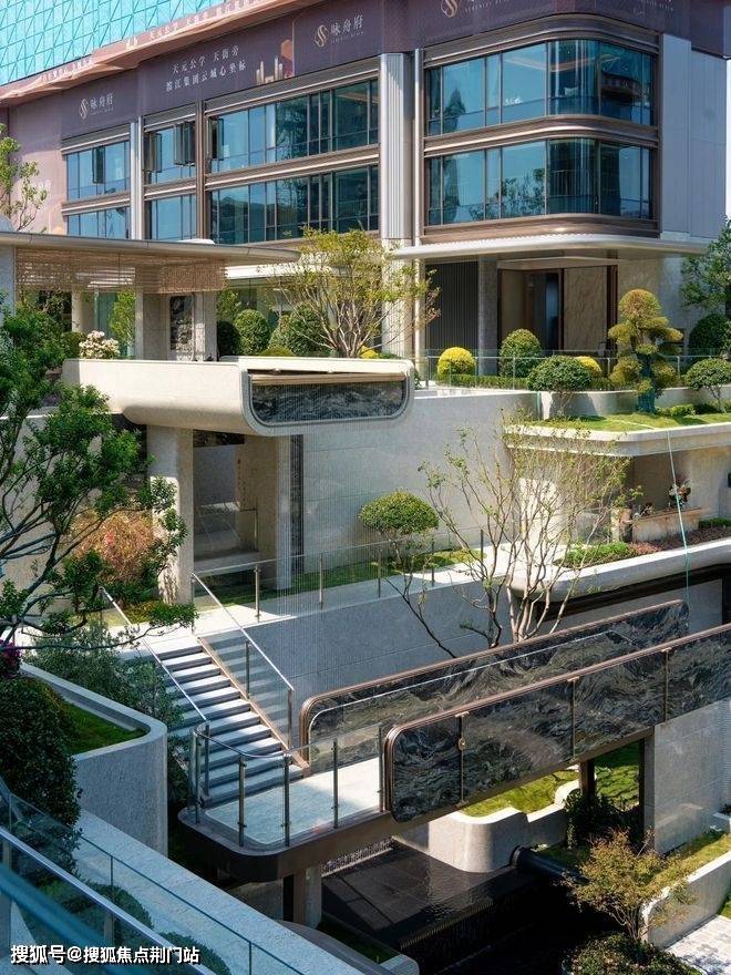 穿过大门,映入眼帘的是中轴下沉式庭院,咏舟府以“漂浮”为设计灵感,精心构筑了立体化、多层次的花园景观。瀑布、水景、植被与观景平台巧妙融合,打造出层次丰富的立体景观空间。未来感与艺术性在此交汇,营造出悬浮于自然之上的生活场景,成为新中心的标志性名片。