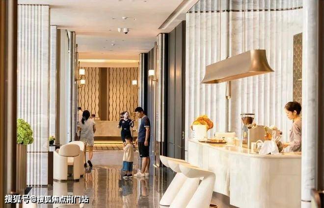 门头高达9.5米,跨度约85米,与鎏金天幕相得益彰,共同塑造出鲜明的街区特色与立体视觉冲击。这一设计不仅作为通行通道,更通过体量、光影与材质的巧妙融合,营造出归家的序厅体验与尊贵氛围。