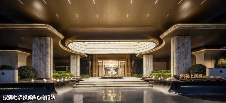 如果近距离看,项目的入口细节之处又不是奢华,尤其是大面积的奢石运用(梵高白奢石+古驰黑石材),绝对是大手笔,再搭配四根梵高白立柱托起古铜色铝板,层层抬升,豪宅大院的气质扑面而来。