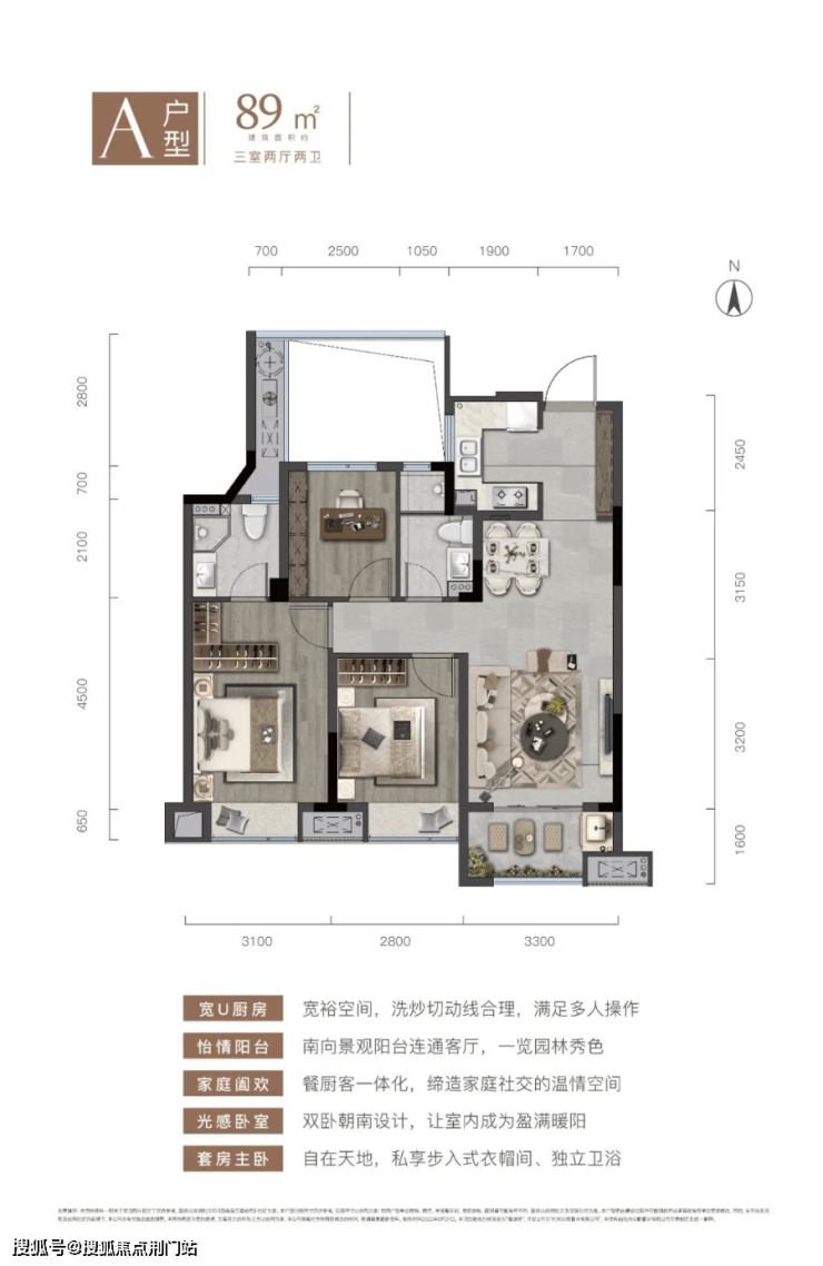 建面约89m²全能大三房,主次卧空间充沛,主卧套房式设计、三开间朝南向、双卫设计,空间多得;建筑面积约105㎡大三房全明户型,双卧朝南、拥约7米南向景观阳台、餐客一体横向约6米宽幅采光。更高的得房率,安放生活多重逸趣。