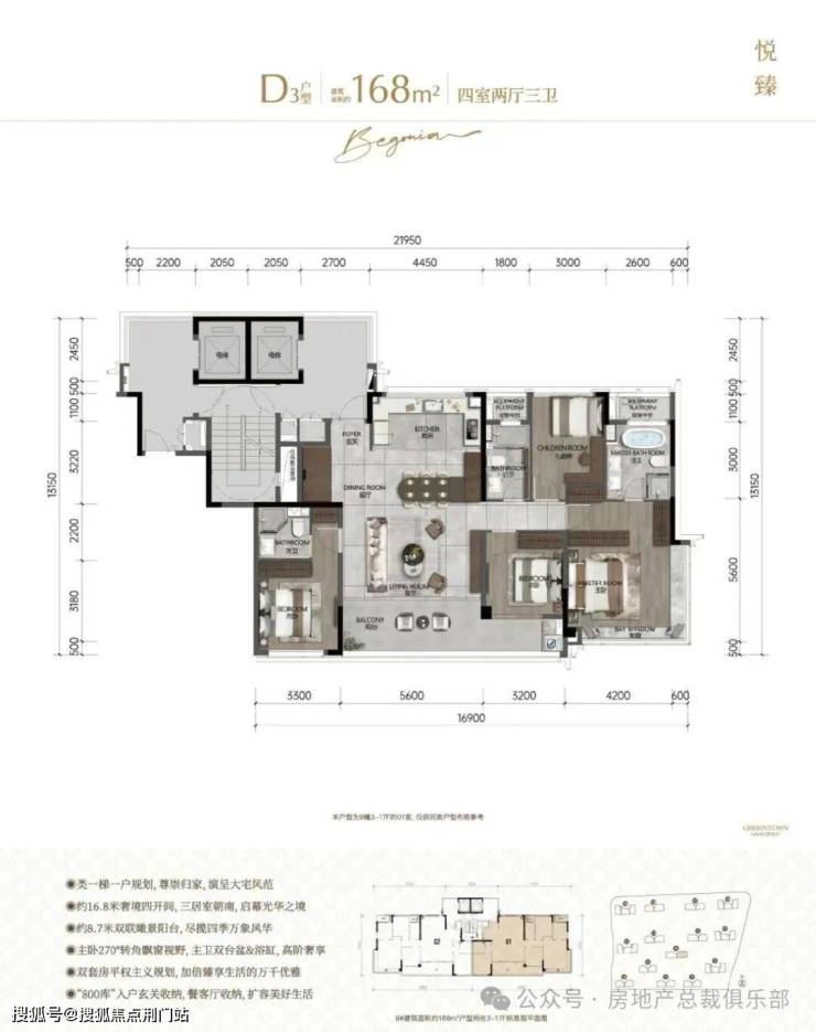 168㎡D1户型·四房两厅三卫,尊享一梯一户归家礼序,创新设计引入光之宴会厅南北双向对流,四开间朝南,面宽扩展至约16.8米,格局方正雅致,配备充足收纳空间,主卧配备270°全景视野,尽享景观盛宴。