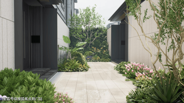比如坊巷的道路采用芝麻灰仿石砖进行铺设,兼具美观与实用。在转角与院门处进行设置不同形态的迷你花园,营造出“立体山水游廊”的景观视觉。