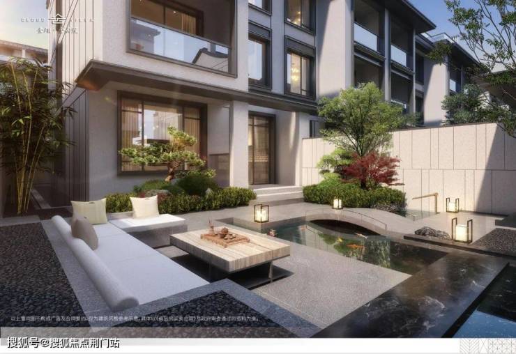 比如实景示范区的样板庭院,我们以“石径引泉,草木映阶”的手法,将一座造型简约的弧形平桥横跨于水池之上,设计巧妙,富有禅意。