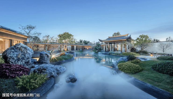 项目以门庭为礼序之始,南、北区各配置磅礴威严国风大门,为每一次回归赋予尊贵仪式感;建筑立面,三面大面积铝板+玻璃、涂料等用材,雕梁画栋国风意境,简约不失华贵;多进式归家园林,汲江南山水、历史源流、人文风物之精髓,绘就东方山水画卷。