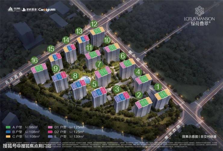 ▲绿荷叠翠轩鸟瞰效果图及户型分布示意