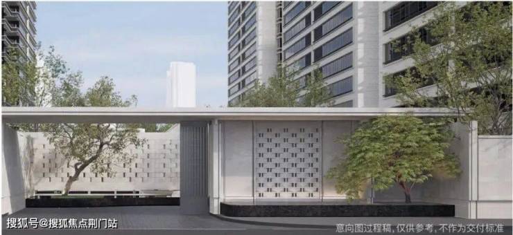 项目西侧主入口是一个宽约35米、高约5.5米的“静藏琉光”大门,景观墙层叠错落,高挑檐顶搭配古朴铜门,宏伟中透着灵动的艺术感。