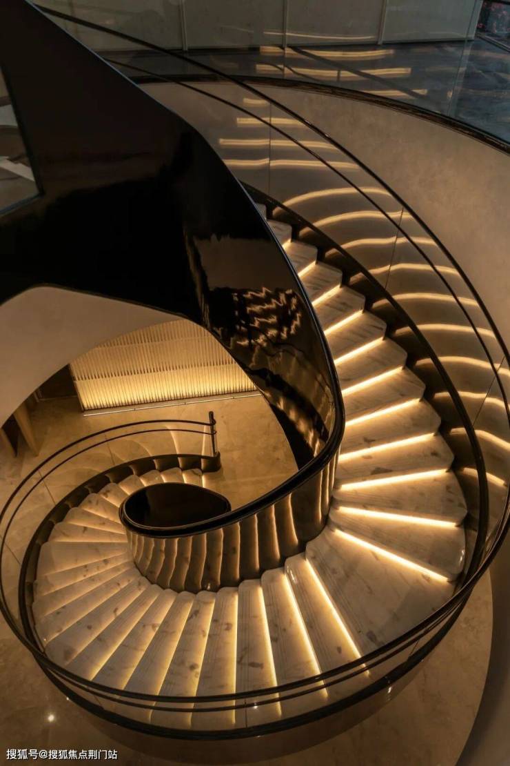 循迹艺术螺旋楼梯拾阶而下,约1500㎡下沉式会所「隐松庭」映入眼帘。
