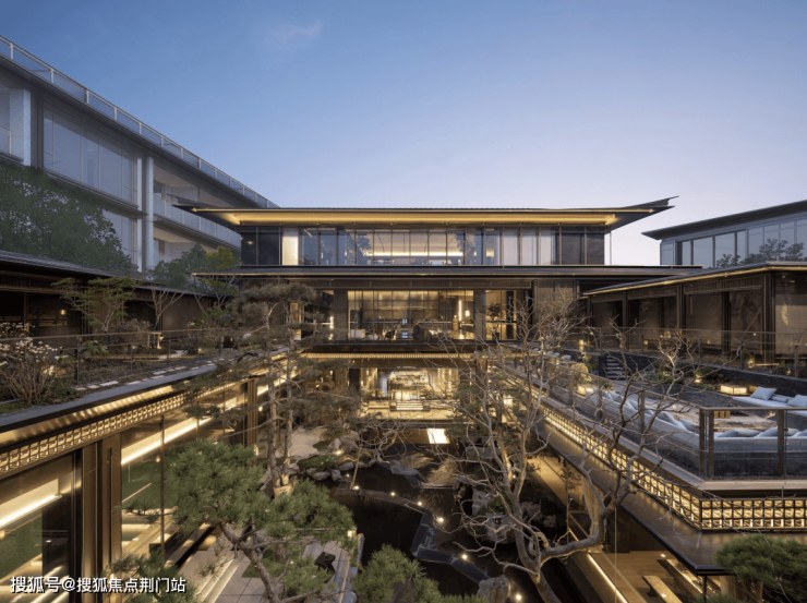 建筑立面:古今交融的诗意表达:外立面以香槟金铝板为基调,搭配蓝眼睛石材与玻璃幕墙,融合传统歇山重檐、纳福悬鱼等元素,既保留宋式建筑的对称美学,又赋予现代建筑的轻盈通透。合院组团采用三面庭院设计,L型景观面与环绕式檐廊,将超山梅影、丁山湖光引入每一扇窗景!