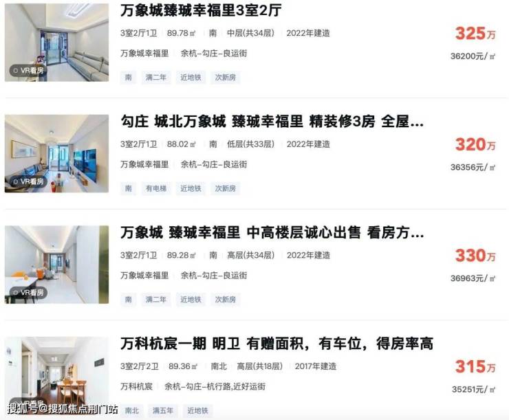 再如,幸福里挂牌均价约3.6万/平,杭宸挂牌价约3.5万/平,万家之星挂牌价约3.78万/平。(数据来源:安居客、杭房数据)