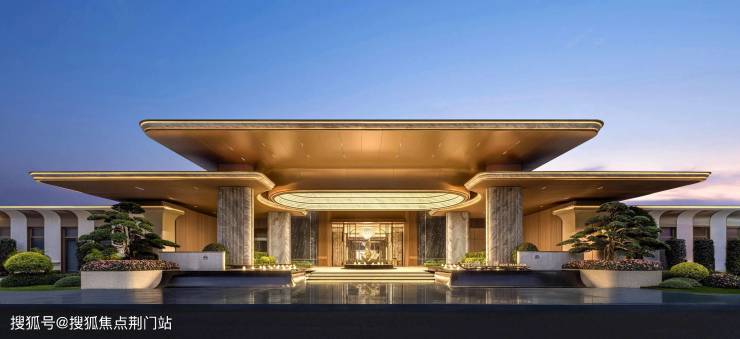宽约78.8米、高约9.2米的大门,奥映鸣翠同款的梵高白石材,温润大气,与古铜色铝板的搭配,透出古典的韵味又不失轻盈。传统建筑穹顶元素也进行了现代化演绎,到了晚上灯光亮起,就变成了金碧辉煌的藻井。