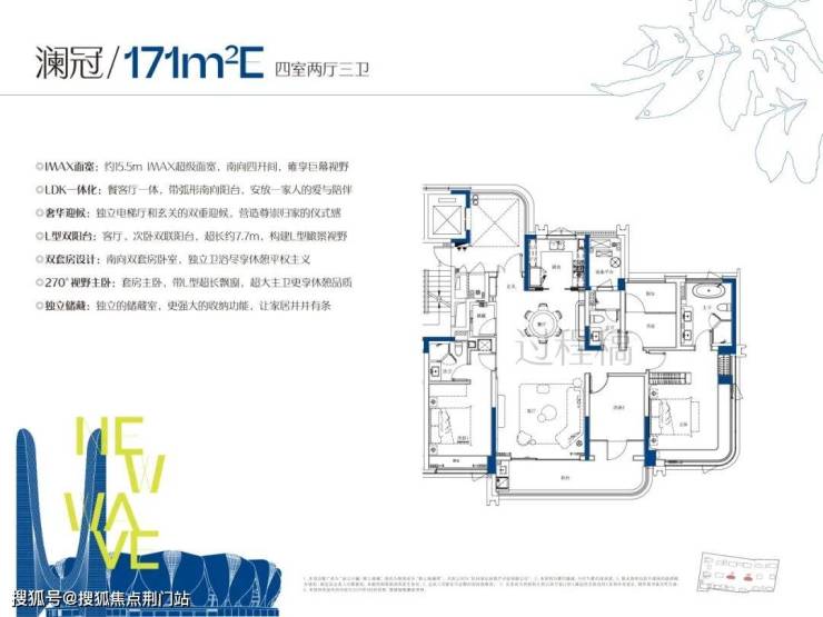 约171方的大四房,三卫双套房,拥有约15.5米南向面宽,主卧L型转角飘窗,总价700万就能实现终极改善。