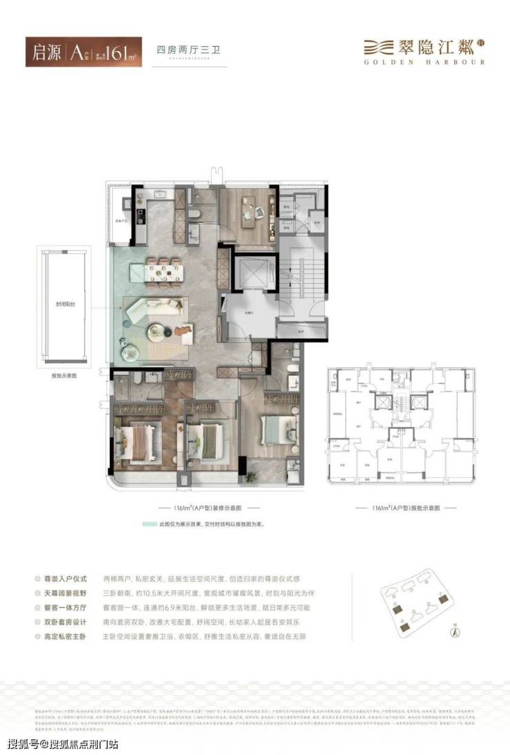 在杭州目前新房市场中,使用率能真正做到约90%的楼盘,凤毛麟角。翠隐江粼轩通过封闭阳台只算半面积+电梯厅空间转化(公区),实现使用率最大化。建筑面积约230㎡户型更是做到了近66㎡客餐厅+双套房布局,空间感媲美很多二手老豪宅的260㎡。
