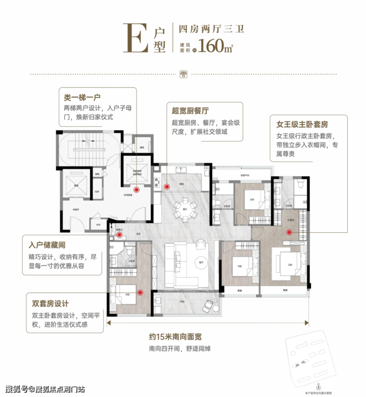 建面139㎡户型,客厅超5米的南向四面宽,大开间短进深设计,主卧带L型转角飘窗,独立全明衣帽间,尊贵感强。建面约160㎡户型南向超15m,四房三卫格局,L型步入衣帽间,更好的私密感。