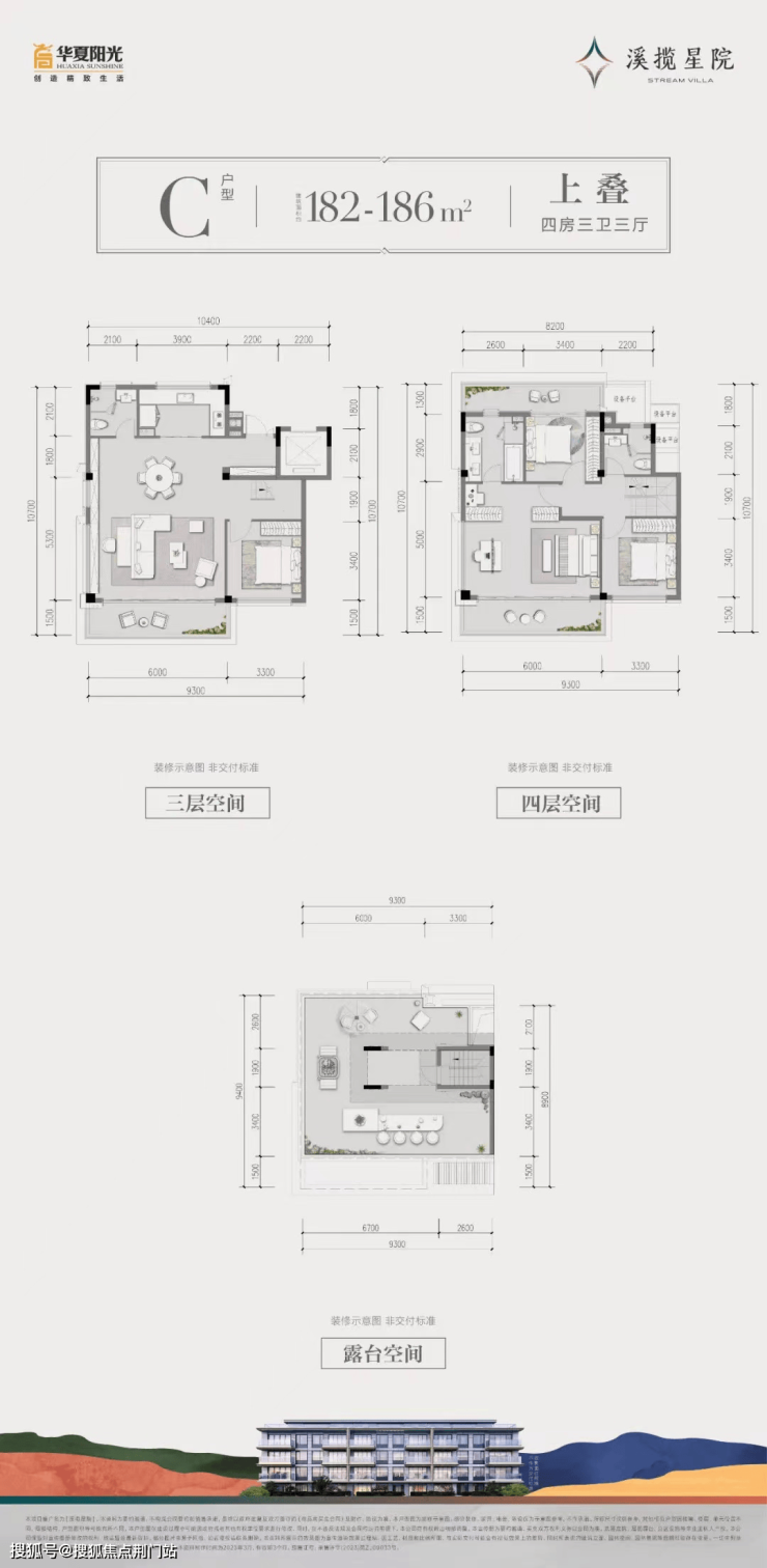 建面约182~186㎡上叠:约6m顶层观景阳台/餐客厅、书房开放设计/套房式主卧