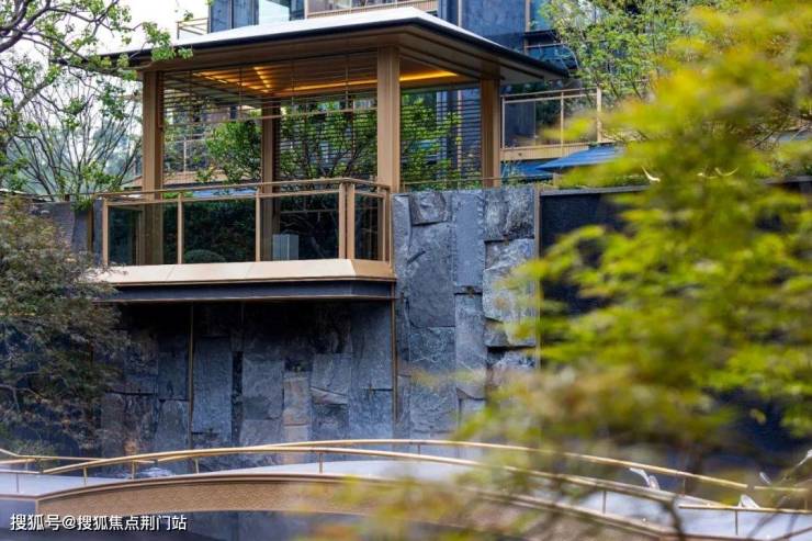 在立面打造上,提取“宋画”中的线条感,提取歇山顶样式,转译形成深远的挑檐,在视觉效果上给人以棱角分明、结构清晰之感,整体呈现一种清雅内敛的当代气质,大尺度巨幕玻璃窗镶嵌金色铝线条,如画框一般,攫住窗外的每一寸风景,让建筑隐于自然