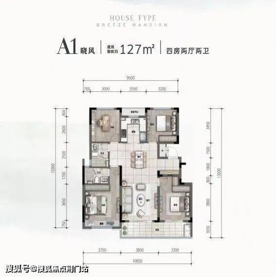 建筑面积约127㎡的户型,四室两厅两卫,得房率达到了约93%(含赠送面积)。