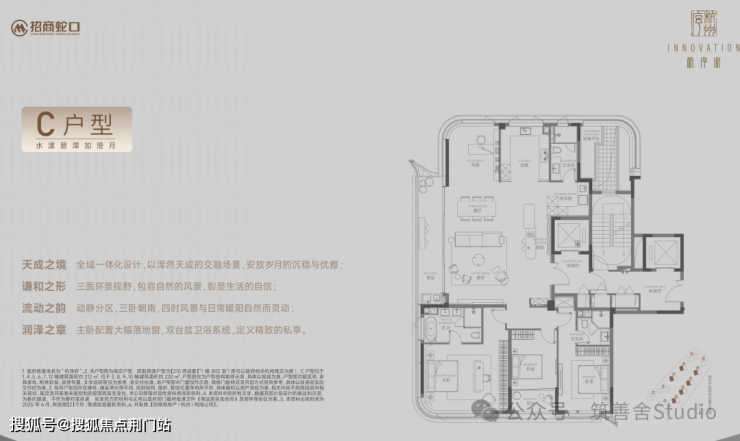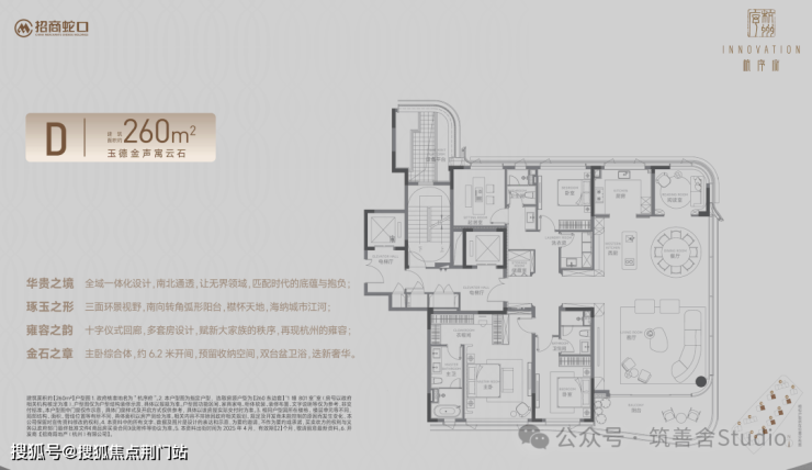 260㎡的五室户型,堪称杭序府的「王者」之作,彰显尊贵仪式与磅礴大气。入门即见气势非凡的十字圆厅,巧妙地将各空间串联,同时营造出自然私密氛围。南向的两个套间设计宽敞舒适,尤其是主卧,配备超大休息区、衣帽间以及朝南卫生间。更令人叹为观止的是270度转角玻璃构成的超大客餐厅,面积高达约76平方米,搭配约14平方米的阳台,带来无与伦比的视觉震撼。