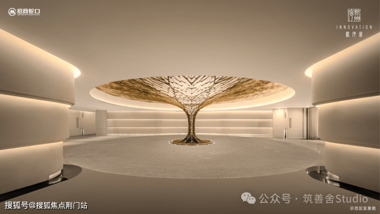 杭序府匠心独运,打造别具一格的「溪谷」门厅,一眼难忘,令人印象深刻。灵感源自九溪烟树的幽深谷景,采用曲面石材景墙搭配香槟金属线条,宛如潺潺溪水般灵动。上方矗立一座气势恢宏的扇形华盖,名为【沧浪华盖】,其错落有致的造型自然勾勒出入门的峡谷景观。流畅的宽阔弧线,起始于主入口处月光米黄的石材(主入口两重门厅的景墙,就用掉了近1000m³月光米黄石材)双曲面墙体,以其独特的气势,强势横跨整个空间。