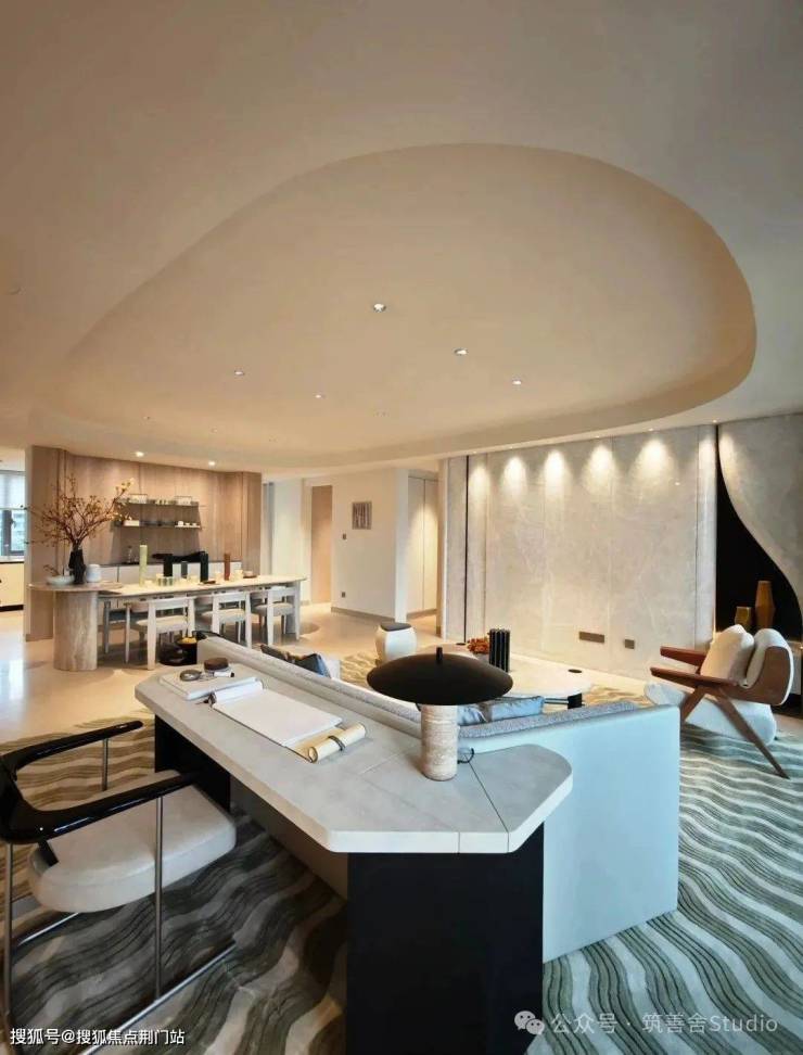 私宴,以撞色绿色石材打造的景墙巧妙划分出休憩与用餐区域,既巧妙掩盖了空间中的柱子,又破解了宽阔空间的单调感。拱券天花与墙面波浪板的和谐呼应,既彰显了空间布局的层次感,又打破了传统对称的僵化。淡雅的硬装色调搭配深邃的中古家具与软装,简约而不失格调,视觉体验清新自然,避免了过度夸张。