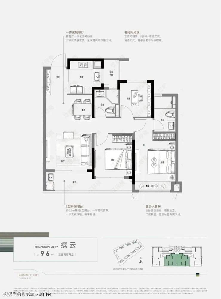 像建面约96㎡户型,整体三开间朝南设计,约9.8m奢阔尺度,户型方正大气,明亮通透,动静分区,再加上约6.6米开阔L型阳台,轻松实现一半洗衣晾晒、一般诗意生活的美妙画境。