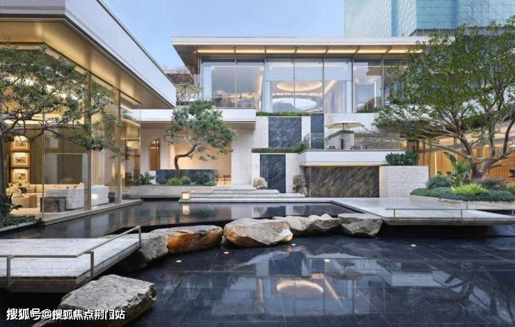 【下沉庭院】庭院巧妙利用约6米的高差,营造出丰富的空间层次感,中央布置大面积立体镜面水景,如诗如画。