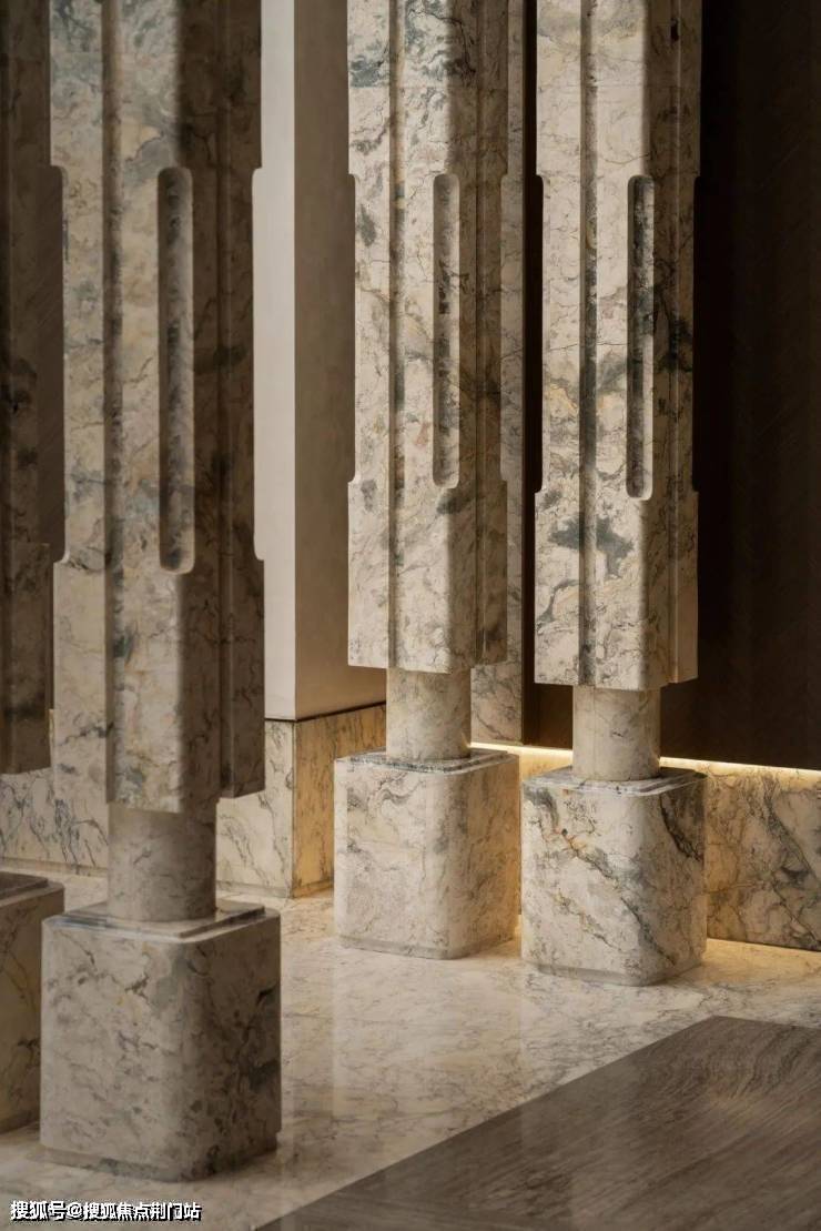 设计师巧妙提取良渚文化的线条语言,将那些镌刻在玉器上的古老符号与自然生长的图谱完美融合。水波纹琉璃壁灯将流动的液态美学凝固于金属支架之间,以光的韵律谱写现代隐奢。