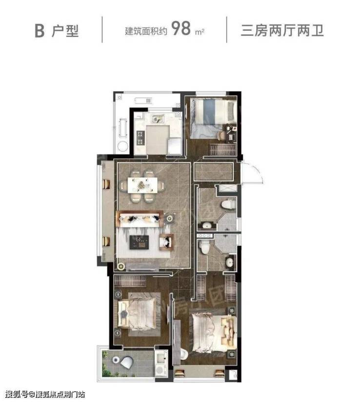 该户型为项目的中间套户型。三开间朝南,采光好!餐客厅一体带南向阳台,晾晒方便,主卧为套房设计带独立卫生间