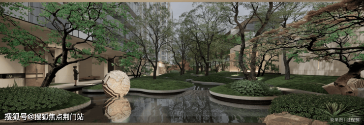 景观设计由北京顺景园林操刀,以“溪山行旅”为叙事主线,打造“归林-观山-临水-栖谷”四重景观序列,中央水景池底镶嵌《溪山行旅图》局部浮雕,实现文化符号的沉浸式植入。