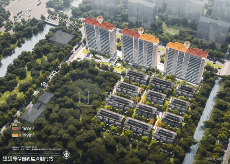 地块于2025年4月1日经70轮竞价,由滨江&中天以28713元/㎡楼面价竞得,溢价率未公开但竞争激烈程度可见一斑。项目总建筑面积约10万方,容积率1.8,规划5栋17层高层(190套)与6栋4层滨水联排(42套),高层面积段169-199㎡,联排300-340㎡,精准定位奥体核心区改善客群。