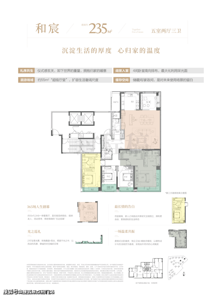 除了标配的电梯厅和玄关外,235方户型还增加了一个约3.5方的储物间,一个约4.1方的家政间,南向生活阳台也有,三卫配置也继续保持,从功能上,基本属于满配功能。