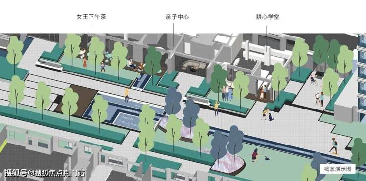 想象下这条「桃李长廊」可以容纳的生活场景,如果从外边回家,顺手生活超市里带点生鲜和蔬菜,也可以去亲子中心里看看玩兴正浓的小朋友,路过「女王下午茶」区,还能和正在跟闺蜜喝茶的太太打声招呼,父亲要是唤你去打局乒乓球,就从社区玄关下楼梯到健身中心。