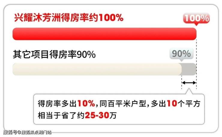 以一般项目得房率平均90%来算,兴耀沐芳洲约100%的得房率,同样百平米户型,兴耀沐芳洲比其它项目多出10个平方,相当于一间卧室;要是换算成房款,直接省下25-30万!相当于花同样的钱,买更大的空间,性价比直接拉到顶!