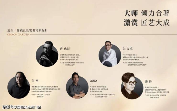 潮映杭园特别邀请了 近境制作创始人唐忠汉、平仄设计创始人朱友庭、木杉景观创意总监JONO、名谷设计创始人潘冉、青墨建筑设计创始人余刚5位设计大师携手打造产品。